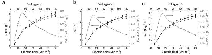 图2所示为NW阵列的热流量Q、温变△T及熵变△S随着外加电场的变化情况。其中热流量可通过热流传感器直接测得,△T及△S由公式计算得到,其中,,T为环境温度,C为比容。当外加电场为60 MVm-1时,BST NW阵列室温下的电热效应(ECE)最显著,此时Q=5.0 kJ kg-1,△T=10.1℃,△S=16.3J kg-1K-1。
