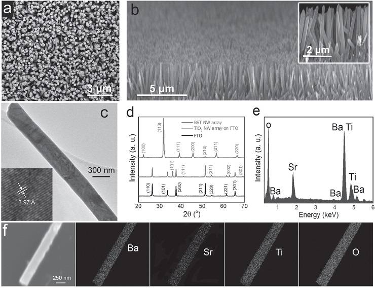 图1a)-c)所示为BST NW阵列的俯视SEM形貌、横截面SEM形貌及HRTEM图像。 BST直径约250 nm,平均高度为3 μm。图1 d)-f) 为BST NW阵列的XRD图谱与能谱分析及各种元素在纳米线中的分布情况。