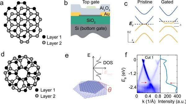 对于AB堆垛双层石墨烯(两层石墨烯间层的扭转角为零),顶层碳原子垂直于底层六元环的中心,这是一种最稳定的双层石墨烯结构。AB堆垛双层石墨烯能带是类抛物线结构。根据AB堆垛双层石墨烯独特的电子结构特点可知,当在其垂直方向上加上偏压后,石墨烯的带隙可以被打开,且其带隙大小可以进行有效地调节。