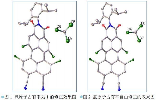 当把溶剂分子按照一个完全占据的 CHCl3 分子进行修正, 即固定 CHCl3 的占有率为 1 时, 发现 Cl5 的温度因子明显大于 Cl6 和 Cl7(图 1),表明 Cl5 的位置处可能有无序,而 Cl5 附近也没有较高的残余电子密度峰, 因此应该不是 Cl5的位置无序导致的,置换无序的可能性较大。 将 Cl5、 Cl6 和 Cl7 的占有率自由修正发现 Cl5 的占有率仅为 0.5, 且其温度因子变为正常大小了, 而 Cl6 和 Cl7的占有率均为 0.9( 图 2)。 如果是一个 CHCl3分子无序的话,那么 3 个 Cl 原子的占有率应该相等,而 Cl5 的占有率却明显小于 Cl6 和 Cl7,因此选取一个 CHCl3分子无序的模型是不合理的。 由于合成人员在培养晶体的过程中还使用了 CH2Cl2 溶剂,由此推测可能是 CHCl3 和 CH2Cl2 两种溶剂出现了置换无序。CH2Cl2的两个氯原子刚好分别位于 Cl6 和 Cl7 附近,而 Cl5 的位置只是 CHCl3 的 1 个氯原子占据。按照这个置换无序模型,最终的精修结果是, CHCl3 的占有率为 0.58,而 CH2Cl2 占有率为 0.42。 这个模型意味着, 58%的晶体是 CHCl3 占据此位置(图 3),剩余 42%的晶体是 CH2Cl2 占据同一位置(图 4)。