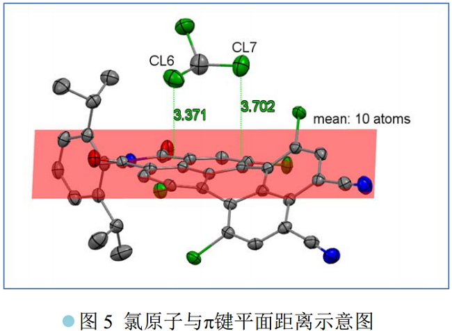 进一步考察这个无序结构,发现从空间对称性的角度看, CH2Cl2 的两个 Cl原子 Cl6A 和 Cl7A 可能出现 3 种空间取向,第一种取向是现有位置 Cl6 和 Cl7,另外两种可能的取向分别是位置 Cl5 和 Cl6,以及位置 Cl5 和 Cl7,为什么后两种取向没有出现呢? 其原因可能是,产物分子存在大π键,且距离 Cl6( Cl6A)和 Cl7( Cl7A) 较近,分别为 3.371Å 和 3.702Å(图 5), 因此,选择第一种取向使得 CH2Cl2 的两个 Cl 原子与主体分子间存在更强的 Cl⋅⋅⋅π分子间相互作用。