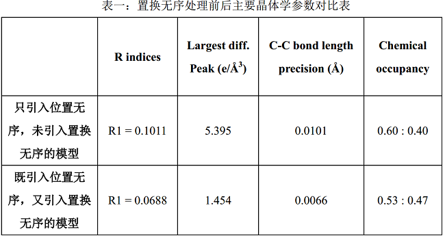 在晶体生长中, 溶剂分子常常会同产物分子共同结晶,而溶剂分子呈现无序也很常见。一般地, 无序类型有两种,位置无序和置换无序。 所谓位置无序,是指 1 个溶剂分子分布在独立区中的多个位置,导致每个位置的占有率都小于 1,但是把每个位置的占有率加合起来等于 1;置换无序是指不同种类的溶剂分子占据在独立区中的同一个位置,导致每种溶剂分子的占有率都小于 1,但是把每种溶剂分子的占有率加合起来等于 1。相对而言,置换无序比较少见, 本文列举两个置换无序的案例。