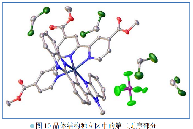通过仔细分析发现,虽然对 PF6-离子做了位置无序处理,即将 1 个 PF6-离子裂分于 2 个位置上,但是,每个位置上都有两个较高的残峰, 参看图 7 中的金色小球。考虑到培养单晶使用的溶剂为 CH2Cl2, 因此,推测剩余的残峰归属于无序的 CH2Cl2 分子。 于是,这个无序模型进一步改进为 PF6-离子和 CH2Cl2 分子的位置无序加置换无序。 当在结构精修中引入这个双重无序模型后,对 PF6-和 CH2Cl2 的键长键角无需施加任何限制, 结构就自然合理, 参看图 8,且最终的一致性因子 R1 也明显下降,见表一。