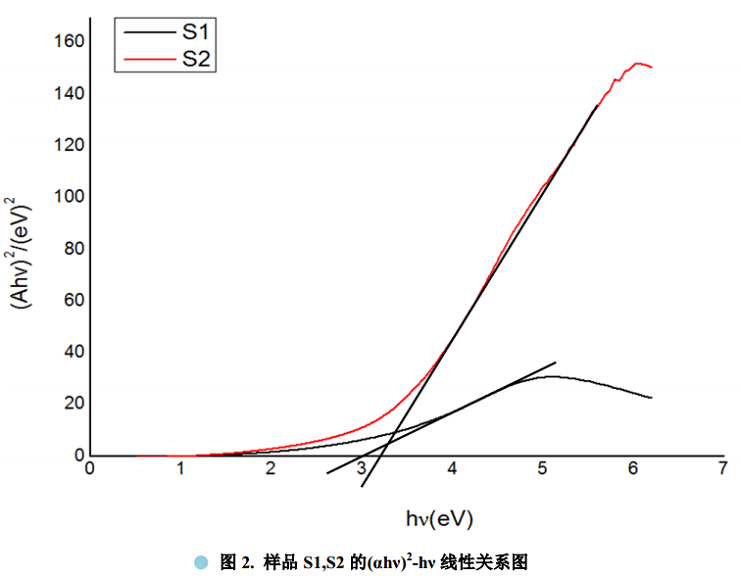 推导方法 1和推导方法 2分别为通过测量样品吸收光谱和反射光谱值来计算半导体材料的光学带隙。下面介绍以直接光学带隙半导体材料( m=1/2) S1 和 S2 为例,通过推导方法 1 计算半导体材料的光学带隙值。首先测得 S1 和 S2 的紫外吸收光谱,如图 1 所示。 然后通过吸收光谱做(Ahν)2-hν 线性关系图,如图 2 所示。沿曲线做反向切线至 y=0 相交,所得值为光学带隙值,由图 2 即可得Egs1=3.0ev;Egs2=3.1ev。