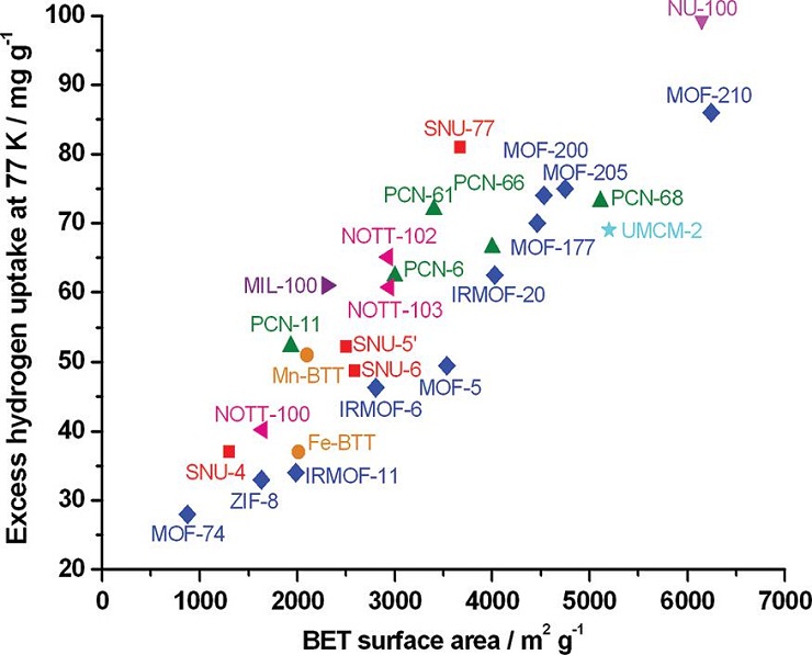 MOF可调节的孔径可以实现对于不同尺寸气体分子的分离,CO2捕捉。它有着大量的孔和特殊的孔道结构,可以实现用于气体的储存,现在MOF-177在77K下的储氢能力已达到很高了。MOF材料在未来将大行其道,将可能改变现在传统的气体存储方式,实现在低的压力下储存更多的气体,降低运输的效率,对于交通运输业影响甚大!