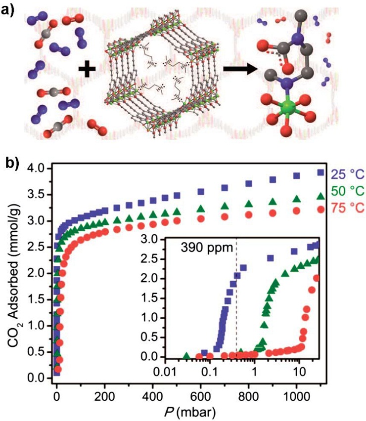 图7 MOF结构示意图与不同温度下对于CO2捕捉性能