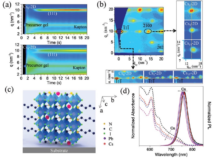 (a).原位GIWAXS测试显示Cs0-2D(Cs掺杂浓度为0)和Cs5-2D(Cs掺杂浓度为5%)样品在溶液旋涂过程中的相变过程;