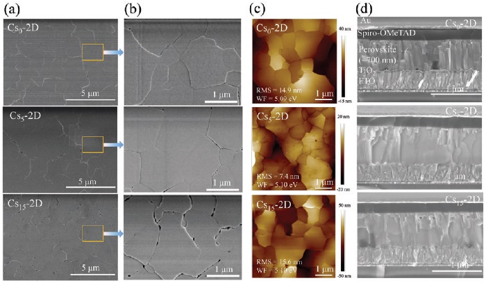(a, b).Csx-2D钙钛矿薄膜的SEM图,低分辨率(a)和高分辨率(b);