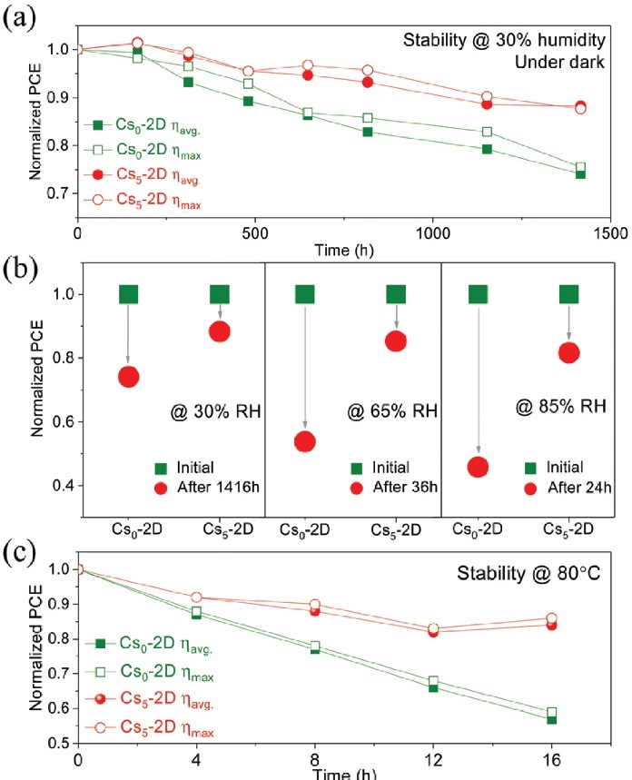 (b). 未封装Cs0-2D和Cs5-2D钙钛矿电池在不同湿度下 (30%、65%、85%) 的耐湿测量;