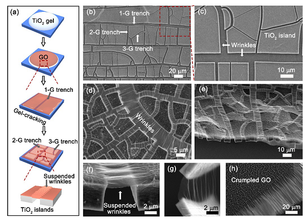 (f)、(g)GO褶皱悬浮在TiO2岛屿间的扫描电镜图
