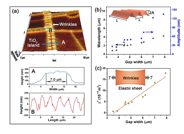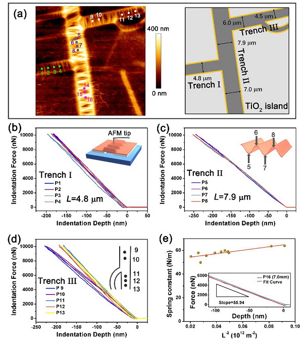 近日,北京大学曹安源教授和曹国鑫教授(共同通讯作者)等人在2D Materials上发表最新研究成果“Self-assembly of suspended graphene wrinkles with high pre-tension and elastic property”。将GO溶液滴于二氧化钛(TiO2)凝胶上,溶液挥发时GO析出成膜,而溶液下方的TiO2凝胶同时干燥皴裂,形成大量的微米级岛屿和沟壑,在沟壑处悬挂着平行的GO褶皱,脱离了沟壑底部的基底表面。非常重要的一点是,在组装过程中,GO与TiO2的强粘接作用使得皴裂的岛屿对沟壑处的GO薄膜产生了较强的预应力,从而得到了含有沿预应力方向排布的稳定的悬浮褶皱结构,薄膜厚度可在几十至几百纳米之间。对所得到的褶皱几何形貌和力学性能进行测试分析和理论计算,从这两个角度获得了GO薄膜的预应力值,且二者结果自洽。原位原子力显微镜(AFM)测试显示出GO褶皱具有弹性变形行为,并且随着沟壑宽度变化,其弹簧常数可调。还原后的GO(rGO)表现出更高的弹簧常数,同时在千次力学循环测试中保持稳定可逆的形变。这种悬浮的定向石墨烯褶皱结构在传感器、致动器、微纳器件中都有着潜在应用。