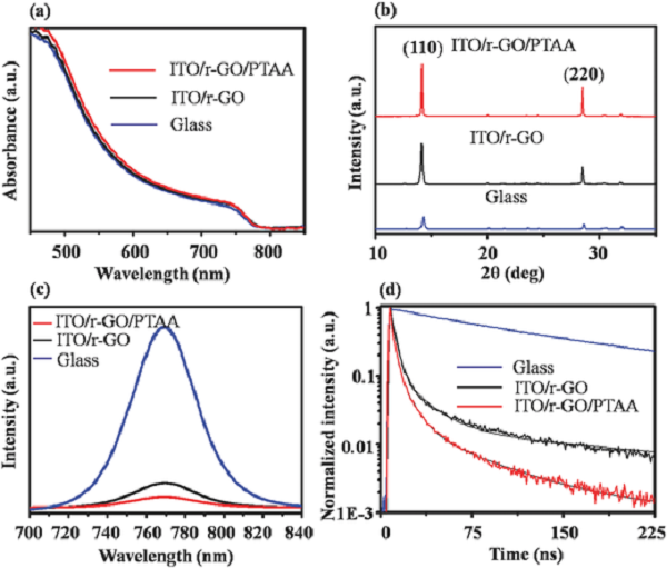 (a) MAPbI3在玻璃,ITO/rGO,ITO/rGO/PTTA基底上的吸收光谱