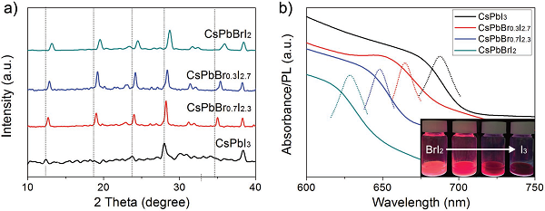 a)典型无机钙钛矿 CsPbBrxI3−x纳米晶体的XRD图;