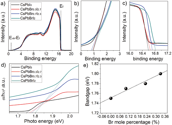 a)CsPbBrxI3−x 纳米晶体薄膜的全紫外光电子(UPS)能谱图;