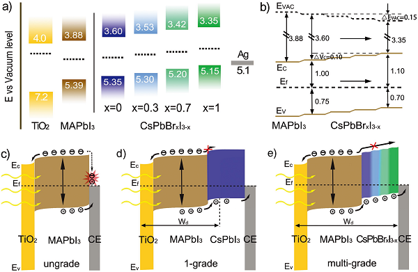 在该项工作中,研究人员首次实现了高性能和稳定性好的MAPbI3CsPbBrxI3−x分级异质结无-HTL的太阳能电池的制备和表征,电池效率PEC达到11.33%。该研究的的重点为通过分级异质结结构改善电池效率,同时为解决无HTL及其它钙钛矿太阳能电池电子空穴提取障碍提供了一种新思路。