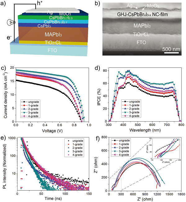 c-d)分级CsPbBrxI3−x 纳米晶体薄膜太阳能电池的J-V曲线和IPCE曲线;