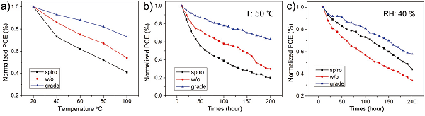 图5 三种不同空穴传输材料钙钛矿太阳能电池稳定性变化(所有电池均未封装)