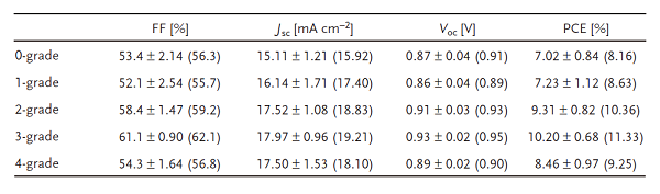 表1 不同分级纳米晶体薄膜的无空穴传输层的优化的钙钛矿太阳能电池的平均性能汇总