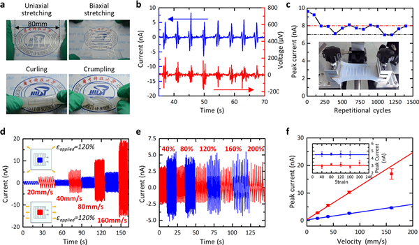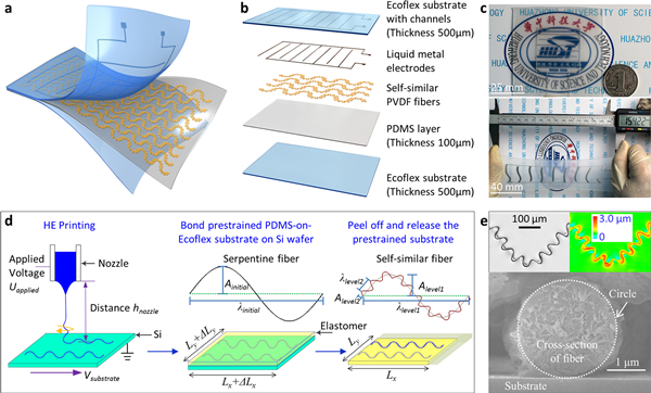 该工作利用成本低廉的螺旋电流体喷印技术(HE-Printing)制备出有超强拉伸性能的自供电传感器,开创了利用低成本工艺制备高性能,高可拉伸性传感器的先河。这种传感器可以实现超高的可拉伸性,超低的探测极限,和极佳的稳定性,这种高性能的传感器有望在新一代人造皮肤中得到广泛应用。