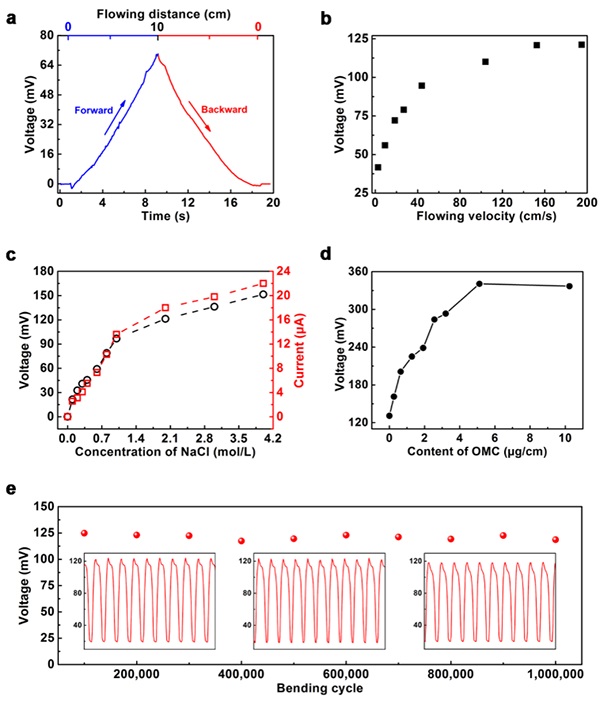 (d) 在饱和NaCl溶液中,输出电压和FFNG的有序介孔碳含量之间的关系(流速为20cm/s);