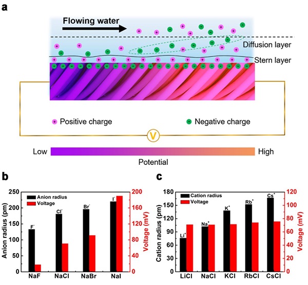 (a) FFNG流动电势的机理示意图,液体中MWCNT的表面形成双电层;