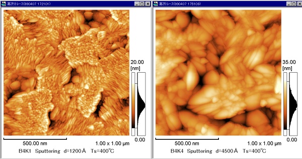 透明导电的ITO薄膜,随着成膜方法、膜厚、基底温度等成膜条件变化, 而表面形貌不同。将膜厚120nm(左)与450nm(右)的ITO薄膜进行比较时,随着膜厚的增加,每个结晶颗粒明显地长大。另外,明显地观察到溅射生长法特有的晶粒-亚晶粒结构。