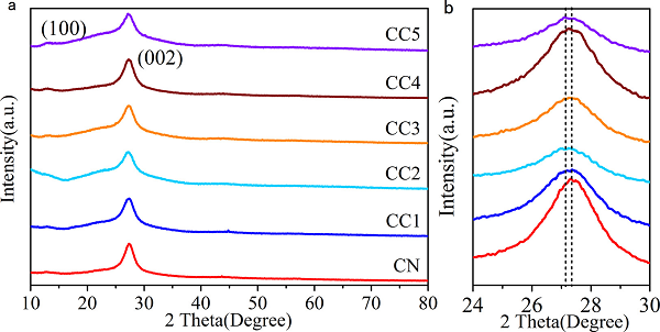 a) CN和C-TiO2/g-C3N4异质结光催化剂的XRD谱图;