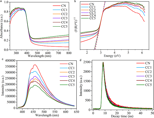 近日,燕山大学刘日平教授、张新宇教授和泰国朱拉隆功大学秦家千研究员(共同通讯作者)等报道了一种具有较窄带隙以及较长载流子寿命的微量碳掺杂TiO2改性g-C3N4(C-TiO2/g-C3N4) ,并在Nano Energy上发表了题为“Rational design of carbon-doped TiO2 modified g-C3N4 via in-situ heat treatment for drastically improved photocatalytic hydrogen with excellent photostability”的研究论文。上述异质结光催化剂可通过简单的热处理法合成。光生载流子分离增强以及较窄的带隙使得光催化活性有所提升,在三乙醇胺溶液中5 h和64h内氢气产生量分别为5.728 mmol/g和52.395 mmol/g。420 nm处C-TiO2/g-C3N4的表观量子效率约为6.2%,是原始g-C3N4(2.6%)的2.4倍。由于其优越的光催化性能和较强的光稳定性,该光催化剂有望在光能转换和环境修复等领域得到实际应用。