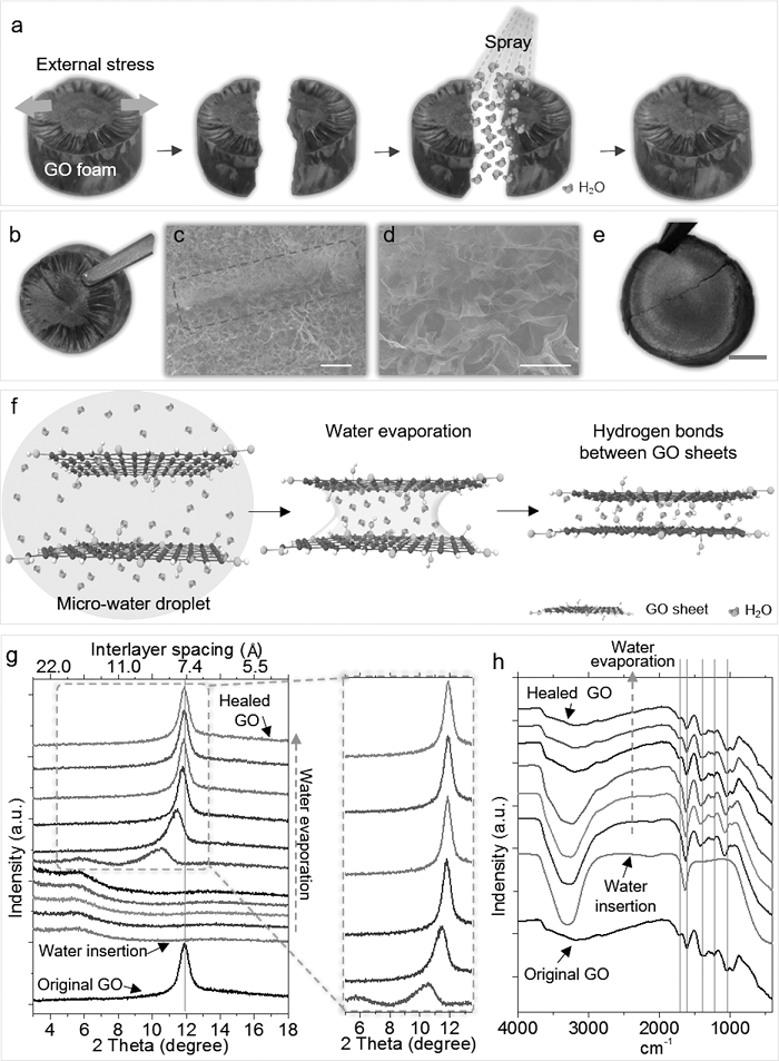 a. 5cm-3的GO泡沫首先被撕裂为两部分,湿气喷洒在断裂位置,之后自愈合为一个整体;