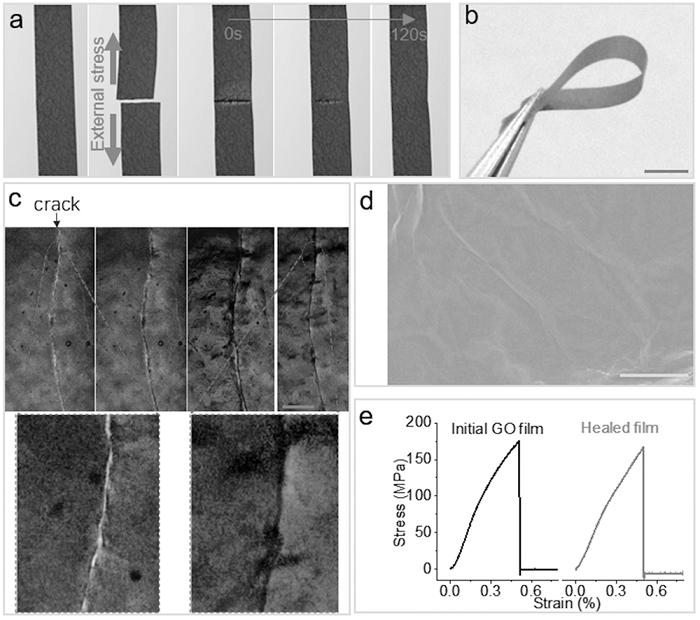 c. 在自愈合过程中GO薄膜断裂处的放大图,标尺:100 μm;