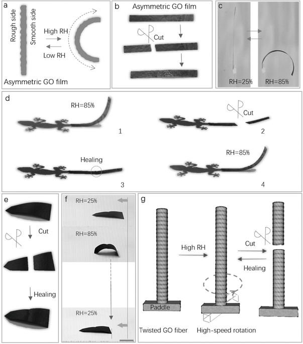 c. 自愈合不对称GO薄膜在湿度变化下的形变响应;