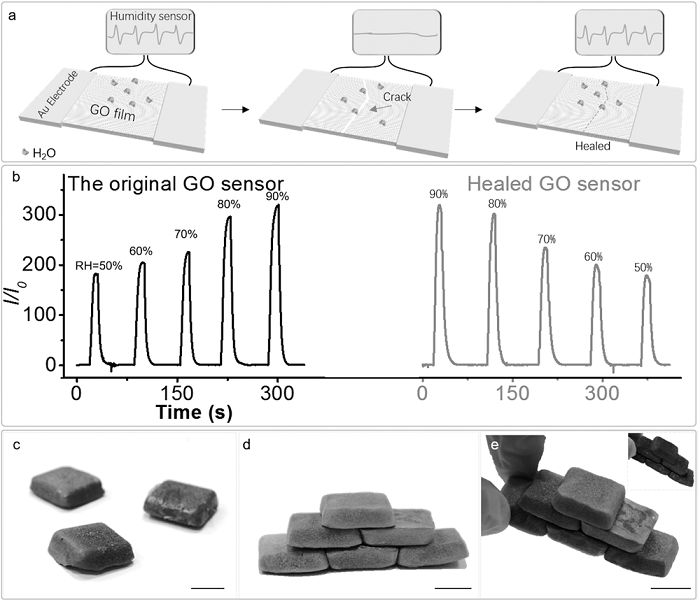 a. GO薄膜湿度传感器在初始态、断裂及自愈合后的示意图;