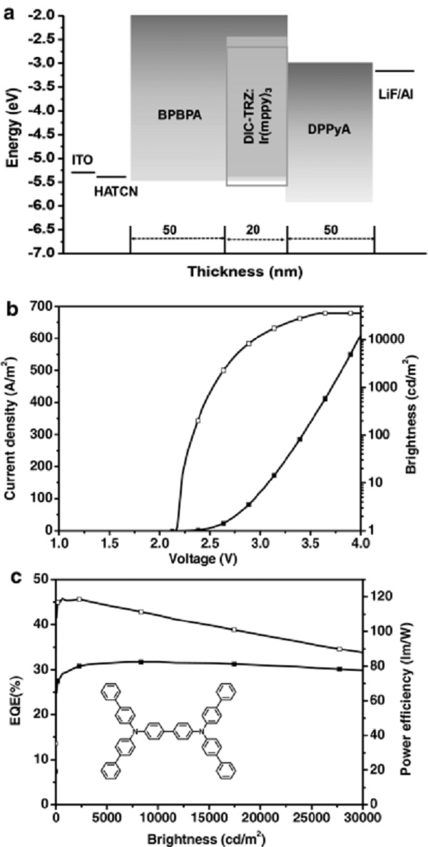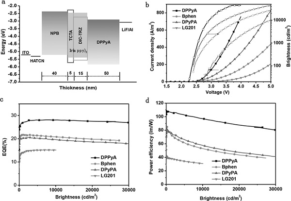 该研究使用了一种具有良好的电子注入及传输能力的蒽/吡啶作为ETM材料,以TADF材料作为主体材料,大大提高了PHOLEDs的PE。对该绿色PHOLEDs进行优化,在5000 cd·m-2 10000 cd·m-2下,驱动电压分别为2.76和2.92 V。对器件进一步优化,在电压3V以及10000 cd·m-2下PE可达到109 lm·W-1,已突破已有文献报道的纪录。该工作显示出对ETM和器件结构进行优化这一策略的重要性,为其走向实际应用铺平了道路。