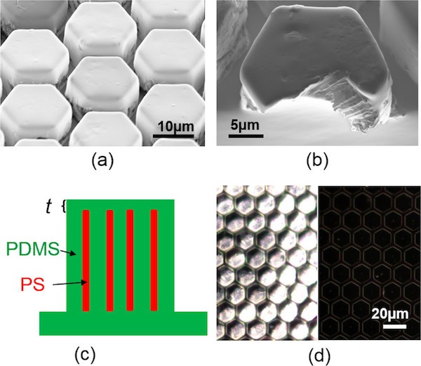 通过有效模仿这种自然界生物体上存在的精巧结构——树蛙粘性脚垫,为新型生物结构粘合剂提供了可能。最近,武汉大学薛龙建教授和德国马普所Arańzazu del Campo教授(共同通讯作者)等人在仿树蛙脚垫黏附结构研究方面取得了重要进展,发表于 ACS Nano, 题为“Hybrid Surface Patterns Mimicking the Design of the Adhesive Toe Pad of Tree Frog”。研究人员研发了一种微纳复合仿生结构。该结构分为两个部分,一种是柔性的硅橡胶(PDMS),另一种则是刚性的聚苯乙烯(PS)纳米棒。硅橡胶有序的构成了分立的正六边形阵列,而聚苯纳米棒则垂直分布于这些正六边形中。这种精细的设计使得接触界面的应力分布得以在300 nm的尺度得到调控。其中应力最小值分布在微米柱的边缘,从微米柱的边缘向中心移动,应力增大。与此同时,较强的粘附力和较高的结构刚度,也增加了该结构的摩擦力,从而实现了黏附力和摩擦力的同时增强。