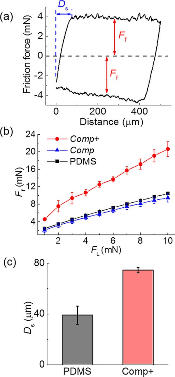 b)含有乙烯基修饰的复合结构(以下记作Comp+),不含乙烯基修饰的复合结构(以下记作Comp)与纯PDMS的黏附力对比。