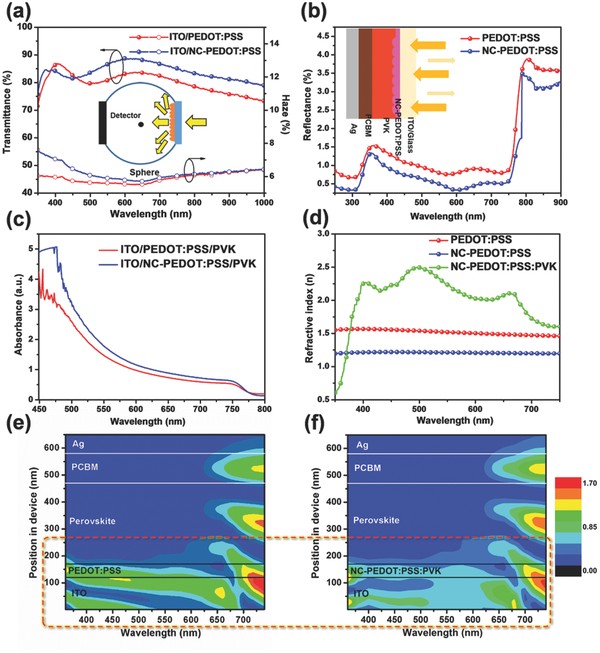 (d)PEDOT:PSS,NC-PEDOT:PSS以及计算的NC-ITO/PEDOT:PSS/PVK薄膜的折射率。