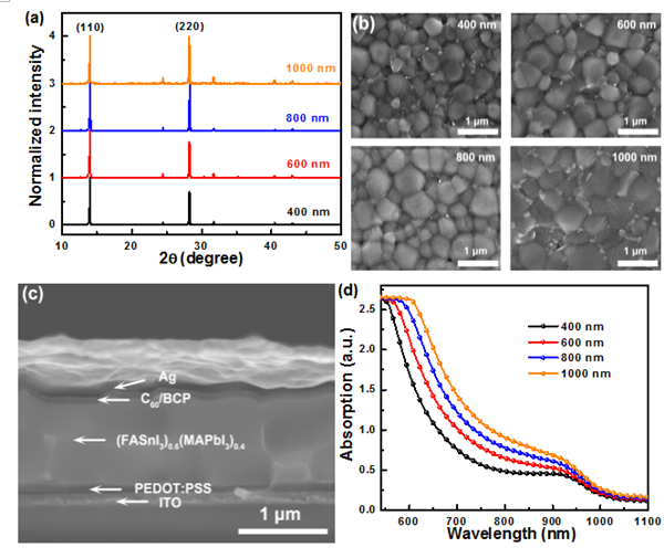 (d) 不同厚度(FASnI3)0.6(MAPbI3)0.4 钙钛矿薄膜的吸收光谱