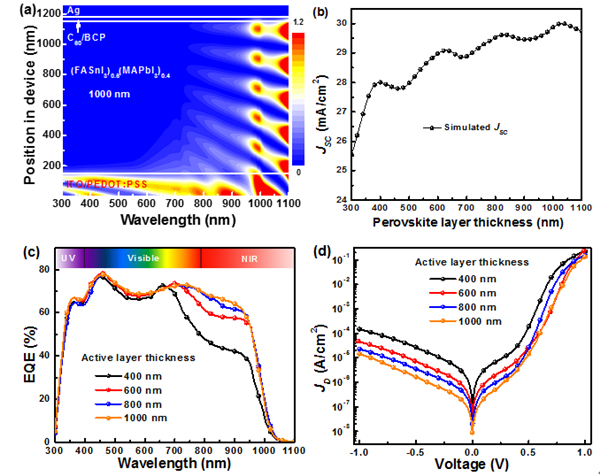 (b) 以1000 nm厚的(FASnI3)0.6(MAPbI3)0.4 钙钛矿作为活性层器件的短路电流