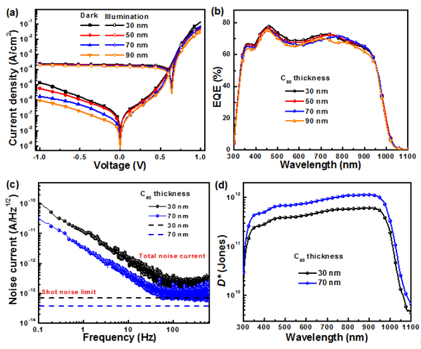 (d) 以30 nm和70 nm C60作为电子传输层器件的比探测率