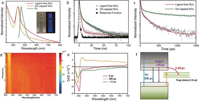 b.无表面活性剂的纳米晶以及油酸包裹的纳米晶时间分辨光谱对比图