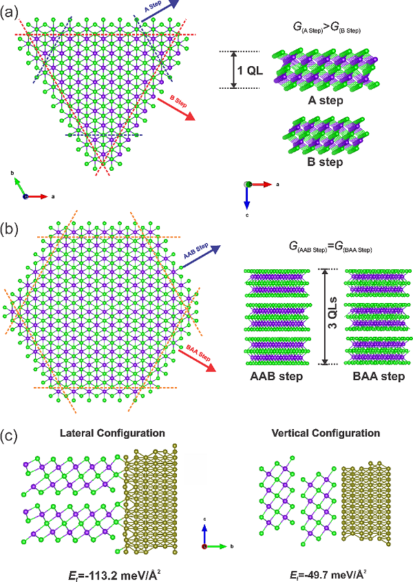 通过计算碲化锑纳米片表面能以及不同位置金属-半导体结合能的差异,结果表明,与垂直方向的异质结相比,侧向构型显示出较低的结合能,这意味着金属纳米粒子具有潜在的选择性生长的能力。
