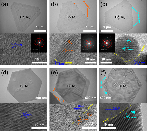 碲化锑和碲化铋纳米片侧面位置合成了自组装的Ag / Cu纳米颗粒装饰清晰可见,支撑了理论计算结果。