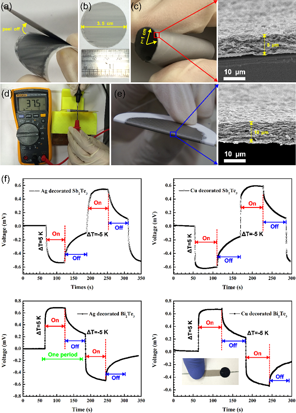 图(4):基于横向异质节纳米片的柔性薄膜(实物图),SEM截面放大图和热电性能测试。