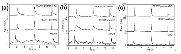 PEDOT-graphene/PtCo:(h) 电流、(i) 电压、(j) 功率信号对比图。