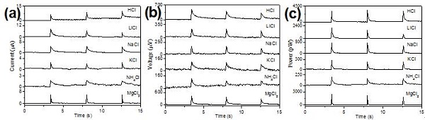 PEDOT-graphene:(e) 电流、(f) 电压、(g) 功率信号对比图;