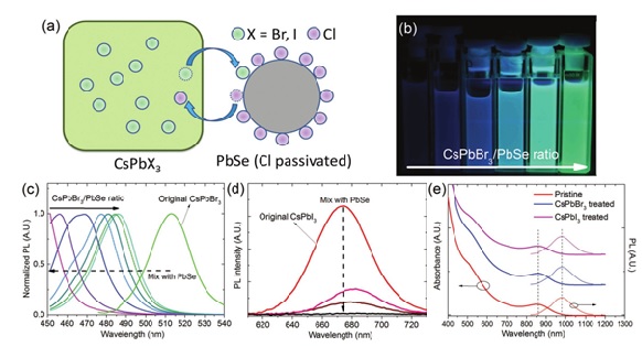 (a)PbSe QDs(Cl钝化) 与 CsPbBr3/CsPbI3钙钛矿纳米晶之间的卤族离子交换过程示意图。