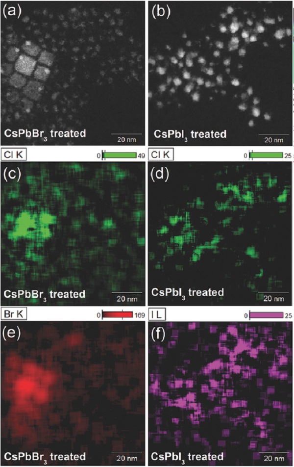 图2. 透射电子显微镜(TEM)下的PbSe QDs与钙钛矿纳米晶混合物和通过X光能量色散谱(EDS)的得到卤族元素分布图。