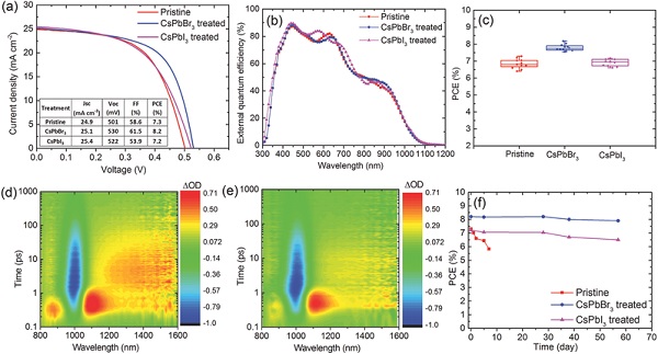 (d)-(e) 未经处理与经CsPbBr3钙钛矿纳米晶处理的PbSe QDs薄膜的瞬态吸收光谱。