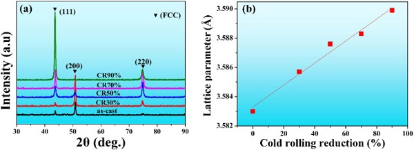 (a) XRD图谱表明经轧制后,其晶体结构并未发生变化。I(111)与I(220)的变化则表明了有新的组织形成;
