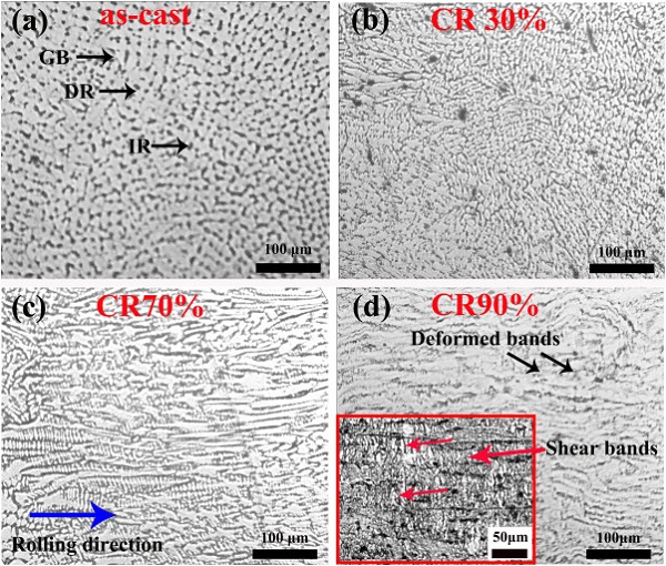 插图表示随着轧制量的增加,晶粒沿着轧制方向发生了严重的变形;在冷轧量超过90%时,电解抛光后的试样可以观察到剪切带。
